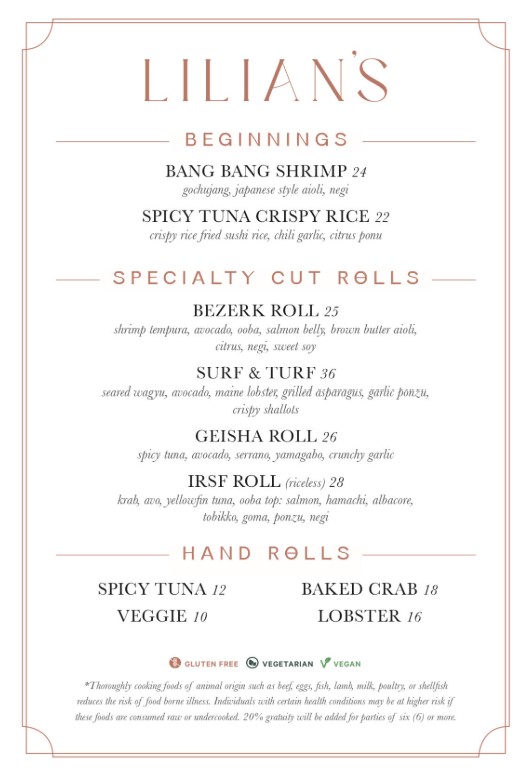 We are delighted to introduce a new culinary experience at Lilian’s—chef-crafted sushi, beginning June 19. Enjoy an inspired selection of cut rolls, hand rolls, and specialty bites that blend Japanese artistry with Lilian’s signature approach to seasonal California cuisine. Available Wednesday through Sunday from 5 to 9 p.m., our sushi offerings are perfectly complemented by craft cocktails and elegant entrées. Whether you're joining us for a casual evening or a special night out, this new addition brings a fresh dimension to dinner in Rancho Santa Fe.